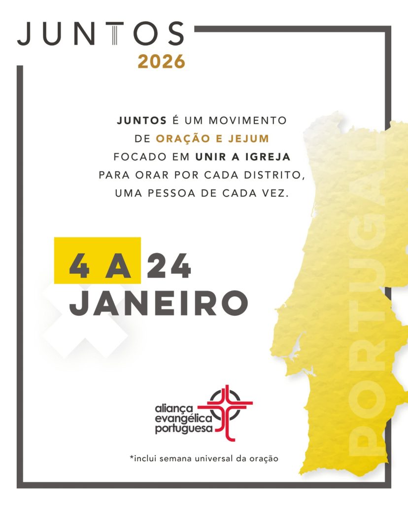 A Campanha de Oração JUNTOS 2026 tem como propósito unir a igreja em oração por cada distrito, uma pessoa de cada vez, fortalecendo a fé e a comunhão entre os cristãos em todo o país. A iniciativa acontecerá de 4 a 24 de janeiro, integrando a Semana Universal de Oração, sob a organização da Aliança Evangélica Portuguesa.