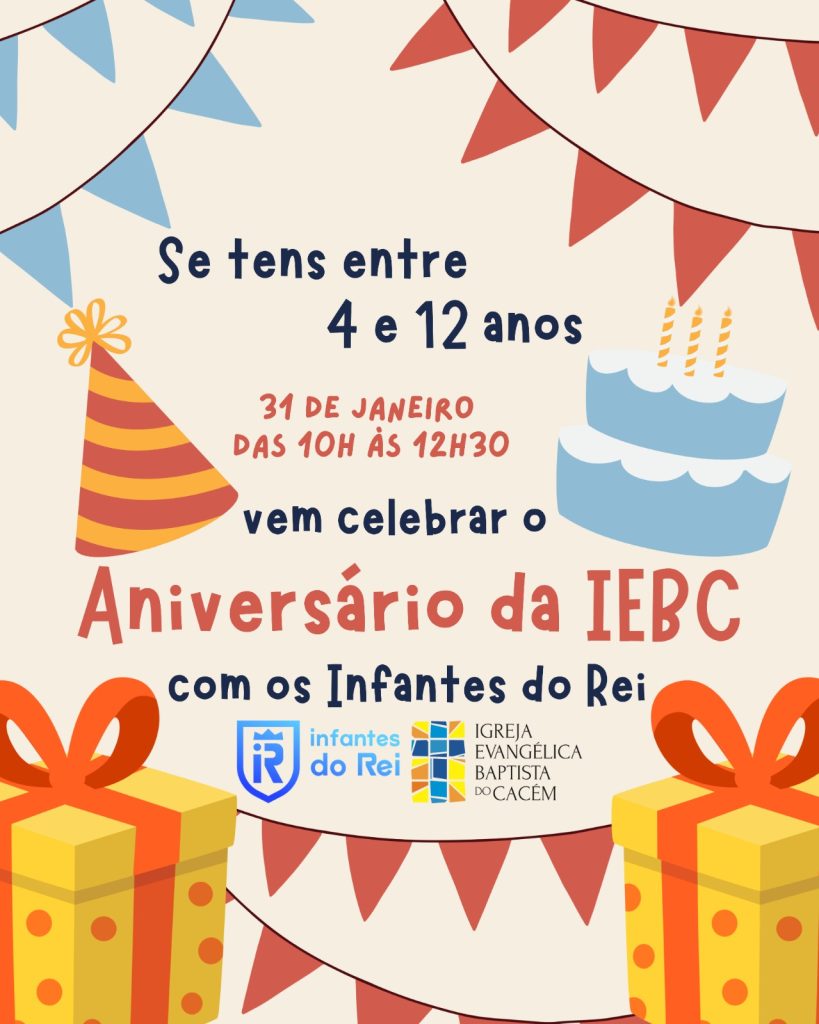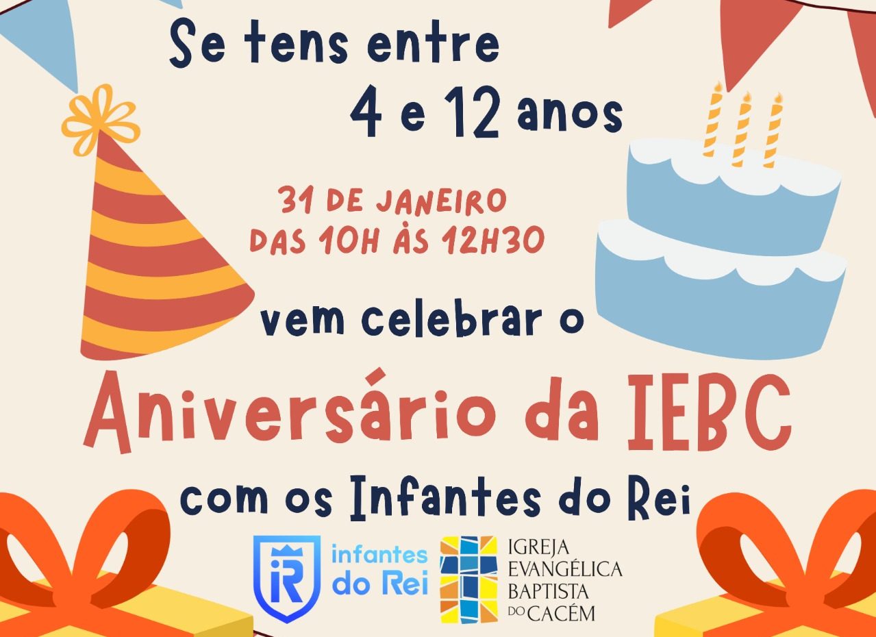O Ministério Infantes do Rei convida todas as crianças entre os 4 e os 12 anos para participarem de uma celebração muito especial em comemoração aos 68 anos da nossa Igreja Evangélica Baptista do Cacém. O encontro será realizado neste sábado, dia 31, das 10h às 12h30, e promete momentos de alegria, comunhão e atividades preparadas com carinho para os pequenos. Será uma oportunidade única para as crianças celebrarem juntas e viverem um tempo divertido e edificante.