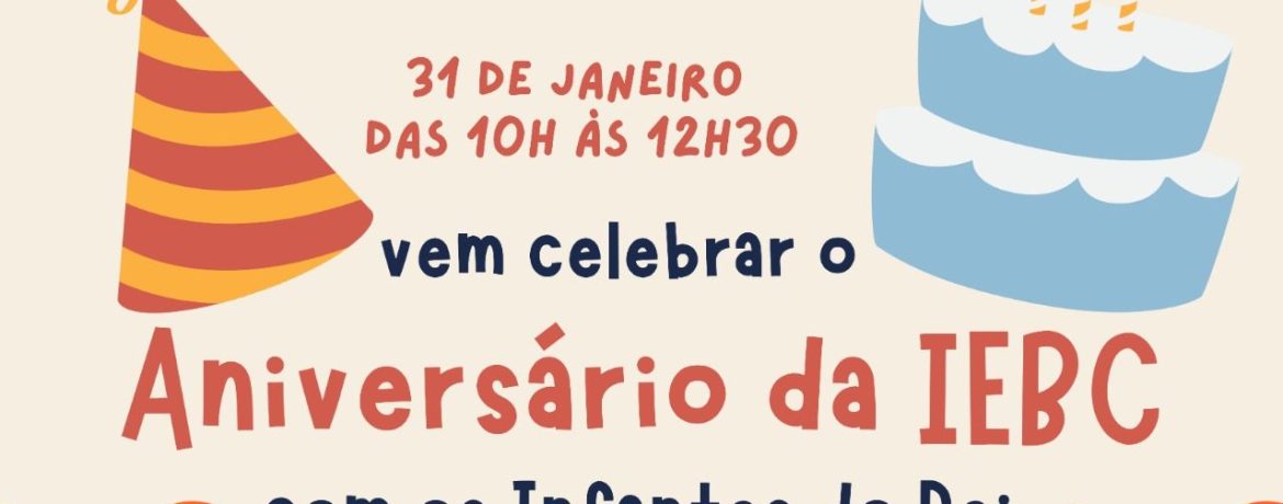O Ministério Infantes do Rei convida todas as crianças entre os 4 e os 12 anos para participarem de uma celebração muito especial em comemoração aos 68 anos da nossa Igreja Evangélica Baptista do Cacém. O encontro será realizado neste sábado, dia 31, das 10h às 12h30, e promete momentos de alegria, comunhão e atividades preparadas com carinho para os pequenos. Será uma oportunidade única para as crianças celebrarem juntas e viverem um tempo divertido e edificante.